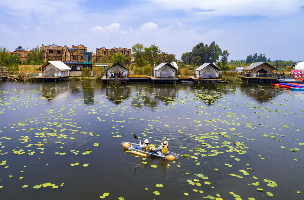 游人在滇池南岸晉寧區(qū)上蒜鎮(zhèn)小漁村劃船休閑(2023年4月30日攝,無(wú)人機(jī)照片)。新華社記者 陳欣波 攝